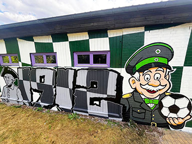 Der Hauptmann von Köpenick als Fußballfan: Der Friedrichshagener Sportverein freut sich über die Neugestaltung der Wand. Foto: dick & bunt